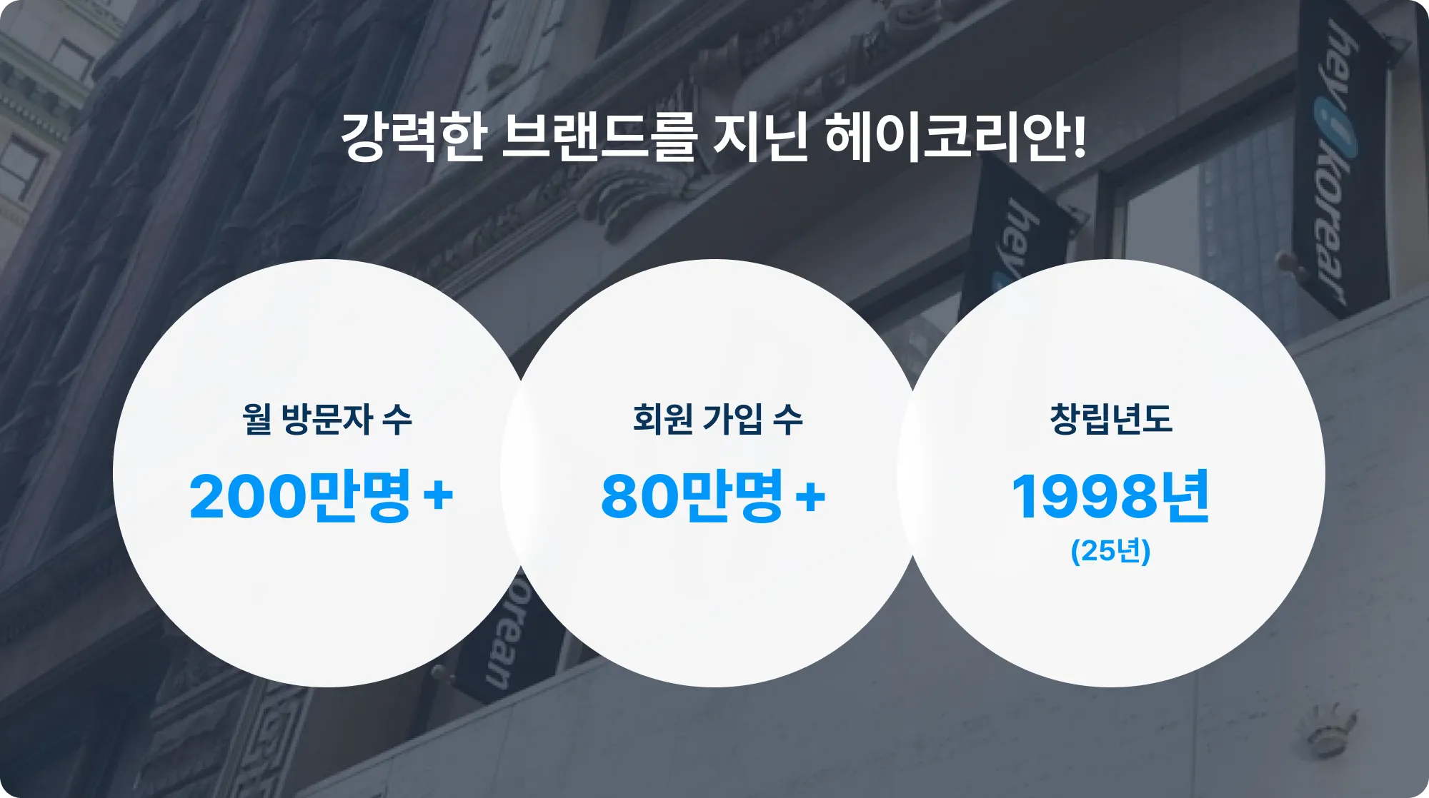 25년의 긴 여정 속에서도 변함없이 성장해온 헤이코리안, 이는 회원들의 해외 생활에서 실질적인 필요를 충족시키는 서비스에 깊이 뿌리를 두고 있기 때문입니다.
